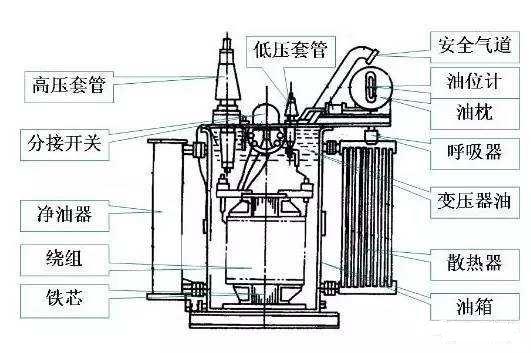 4、保护装置:有储油柜、净油器、吸湿器、安全气道、气体继电器和测温装置等。